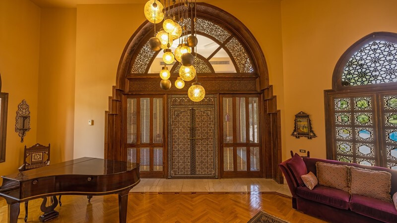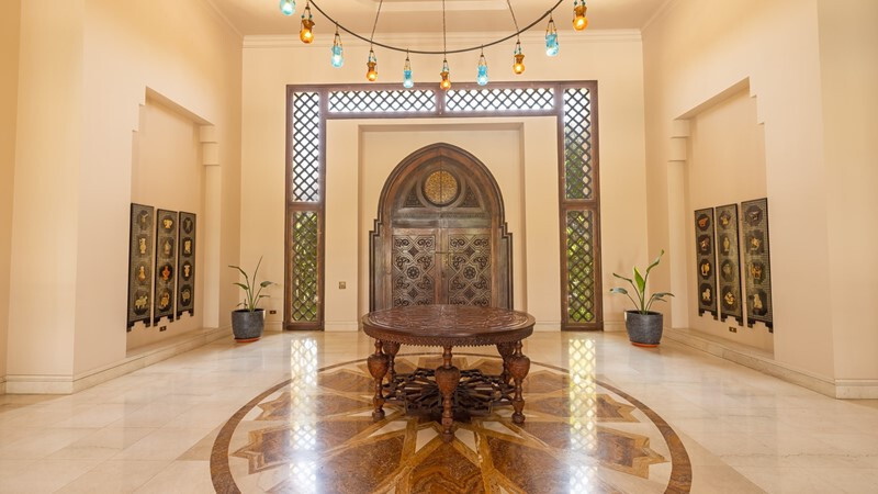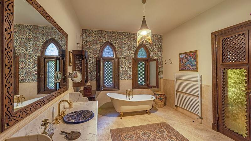 Sitting proudly on a sprawling eighteen-acre estate, this property showcases a captivating Arabian design, boasting domed ceilings, exquisitely carved wooden doors, and elegant Mashrabiya windows.